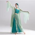 レディース古典ダンス衣装5点セット チャイナ 中華ダンス 衣装 緑系 「青蛇」古典舞踊 中国踊り ダンス衣装 ロング丈ブラウス スリット ガウチョパンツ ワイドパ