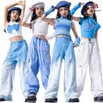ブルー グラデーション キッズダンス衣装 白 セットアップ 女の子 ジャズ チア ヘソ出し 演出服 ヒップホップ カーゴパンツ デニムパンツ ロングパンツ 長ズボン