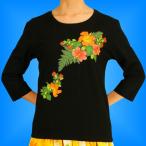 フラダンス 7分袖 Tシャツ S ハイビスカス&レフア ブラック 883sb