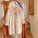 可愛いフランス風女の子ワンピース 花柄 長袖ワンピース 春秋 ギャザー お嬢風 フレア袖 フランススタイル 通常着 幼稚園 コットン100% パーティー