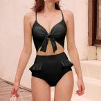 ソリッドカラー ツイスト ハイウエスト タンキニ スイムウエア 女性 レディース 水着 ビキニ セットアップ 夏 サマー リボン ギャザー