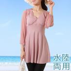 ラッシュガード レディース トップス 長袖 水陸両用 泳げる 服見え クロップド丈 体型カバー Vネック 胸元 ギャザー 襟 裾 袖 黒 白 海