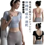 ヨガウェア トップス 半袖 ハーフ丈 Tシャツ バッグデザイン ヨガトップス ショート丈 パッド付き 無地 シンプル へそ出し ウエスト 細見え スポ