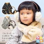 【2点セット】マフラー&イヤマフ キッズ 子ども 秋冬 ファー チェック柄 リバーシブル 防寒 ネックウォーマー 耳あて イヤーマフラー ふわふわ