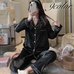 パジャマ ルームウェア 上下 2点セット レディース 女性 サテン調 ロングパンツ 長袖 オープンカラー 前ボタン 前開き 胸ポケット お洒落 シンプ