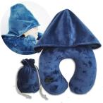 ネックピロー フード ベロア 折りたたみ 空気 首 枕 (ネイビー, サイズ:縦/約29cm 横/約30cm 厚さ)
