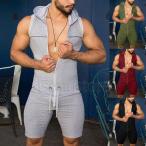 ジャージ メンズ つなぎ 上下セット ノースリーブパーカー オーバーオール フード付き ハーフパンツ サロペット サマー 夏 スリム 細身 体型カバー スポーツ