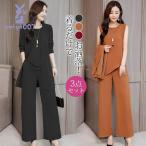 パンツセットアップ レディース 夏 秋 パンツスーツ 上下セット 3点セット ワイドパンツ ガウチョパンツ ブラウス ハイウエスト 入学式 卒業式
