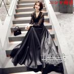 カラードレス カクテルドレス ブラック 黒 Vネック ロングドレス パーティードレス 発表会 演奏会 イブニングドレス フォマール 大人 バルーンスリーブ