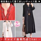 チャイナドレス チャイナ服 ★chaiはポイント最大3倍★ ワンピース 刺繍えり袖 チャイナボタン ロングワンピ 素朴な風合い 長袖 ロング丈 zl473