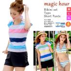 水着 レディース フィットネス ビキニ タンキニ 体型カバー 4点 セット セパレート ホルターネック ボーダー 柄 大きいサイズ スイムウェア 短パン Tシャツ