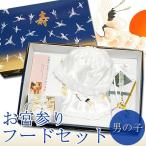 お宮参り 日本製 男の子 フードセット「白色」フード(帽子) よだれかけ お守り袋 末広扇子 4点セット 化粧箱付き (メール便不可)<R>