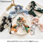 シュシュ ボタニカルデザインスカーフショートサイズ結びシュシュ 草花 サテン リボン 大人 スカーフ 上品 華やか
