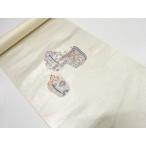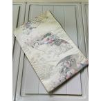 名古屋帯 銀色系 草花文 扇 鳥 菊 幅約30cm 着物帯 正絹 TCS着物 W39