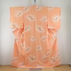 紬 着物 ベージュx薄オレンジ色 蝶々模様 袷 広衿 正絹 仕立て上がり着物 身丈153cm
