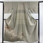 訪問着 身丈156cm 裄丈62cm S 袷 秋草 地紋 刺繍 染め分け 灰茶 正絹 秀品 中古 在庫一掃
