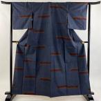 紬 身丈161.5cm 裄丈64cm M 袷 段縞 花唐草 紺色 正絹 秀品 中古 在庫一掃