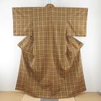 紬 着物 格子模様 辛子色x黄色 袷 広衿 正絹 仕立て上がり着物 身丈158.5cm