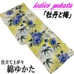 ゆかた 牡丹に梅柄 浴衣 古典柄 仕立て上がり 白 黄 青 牡丹 梅 涼夏あそび 変わり織り 和風 綿ゆかた フリーサイズ 綿浴衣 レトロ 綿100% モダン プレタ浴衣