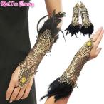 フェザー&ストーン付き ワンフィンガー 編み上げ グローブ(両手セット) 羽根 黒 ゴールド ループ付き ウェディング ダンス 衣装 衣裳 レディース