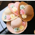 ec005【ゆうパケット送料無料】麦わら帽子 キッズ 花コサージュ 葉っぱ キッズ ベビー 赤ちゃん UVカット 帽子 ペーパー素材 紫外線対策 日よけ 海