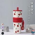 ウォーターボトル ストラップ付き ステンレス製 再利用可能 ポータブルコーヒーカップ 旅行用 漏れない 保温保冷タンブラー 蓋・ストロー付き