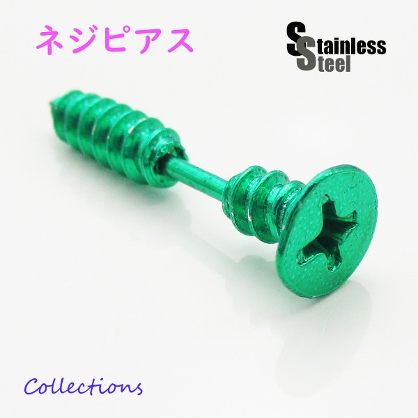 ステンレス リアルなネジのピアス(4)緑色 片耳売り 工具 グリーン 316L メンズ レディース 送料無料 金属アレルギー対応