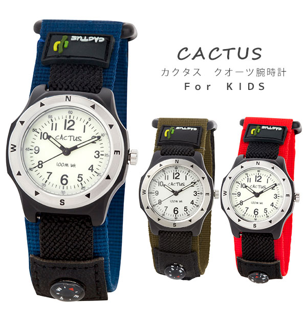 そんなCACTUSから、本格ボーイズ向けウォッチが登場しました。キッズウォッチながら、10気圧防水の高い防水性能を誇る本格仕様。バンドは着脱がラクにできるマジックテープ式で、好奇心旺盛な男の子の冒険心を刺激する方位コンパスも搭載しました!さらに、文字盤・針には蓄光作用があり、暗闇でも視認性ばっちり。まさにアクティブなボーイズにぴったりのアイテムです。