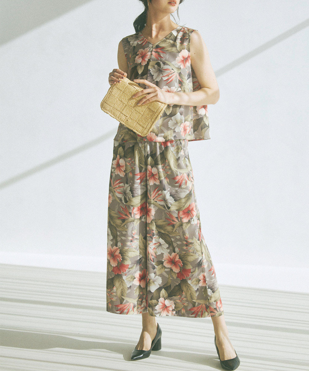 ノースリーブブラウスと短めのワイドパンツで楽をしながら、きれいに見えるセットアップ。グレーベースにピンクを効かせた大人配色。