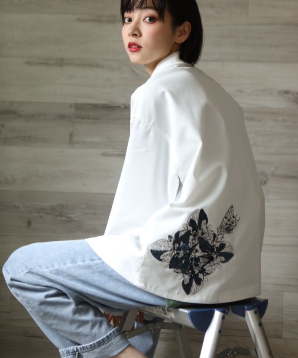 バックにオリジナル手描き蝶々が花に立てる刺繍はおしゃれなポイントです。