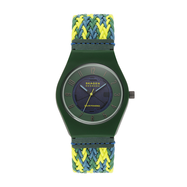 GRENEN SAMSシリーズは、Skagen史上最もサステナブルなシリーズです。#tide ocean material製の37mm径ケース、ケースバック、ダイヤルが特徴のウォッチです。シーウィードカラーのダイヤルはソーラームーブメントが見えるデザインで、ムーブメントホルダーには一部にキャスターオイルクリスタルを45%使ったバイオベースナイロンを使用。rPETを100%使用したマルチカラーのウーブンストラップには、ステンレススチールのバックルとレザーキーパーを組み合わせています。ウォッチストラップは付け替え可能です。#tide ocean material製のケースバックには刻印できません。