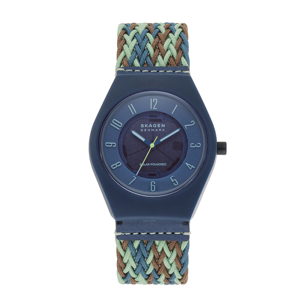 GRENEN SAMSシリーズは、Skagen史上最もサステナブルなシリーズです。#tide ocean material製の37mm径ケース、ケースバック、ダイヤルが特徴のウォッチです。オーシャンブルーのダイヤルはソーラームーブメントが見えるデザインで、ムーブメントホルダーには一部にキャスターオイルクリスタルを45%使ったバイオベースナイロンを使用。rPETを100%使用したマルチカラーのウーブンストラップには、ステンレススチールのバックルとレザーキーパーを組み合わせています。ウォッチストラップは付け替え可能です。#tide ocean material製のケースバックには刻印できません。