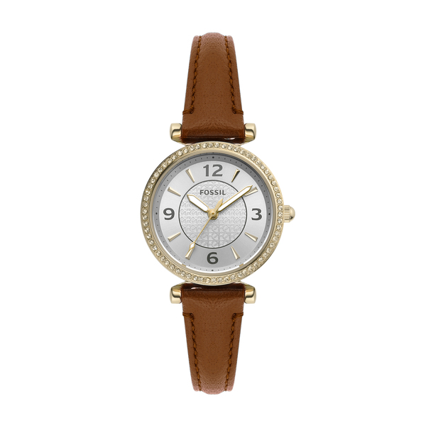 28mm径のケースに三針ムーブメントを搭載したCARLIE。シルバートーンのサンレイダイヤルに、ミディアムブラウンのレザーストラップを組み合わせました。 Fossilのレザー製品は、Leather Working Group(LWG)を通じて責任あるものづくりを支援しています。