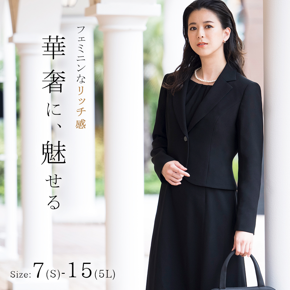 着丈が短めなテーラーカラージャケットを組み合わせたブラックフォーマル(喪服・礼服)です。