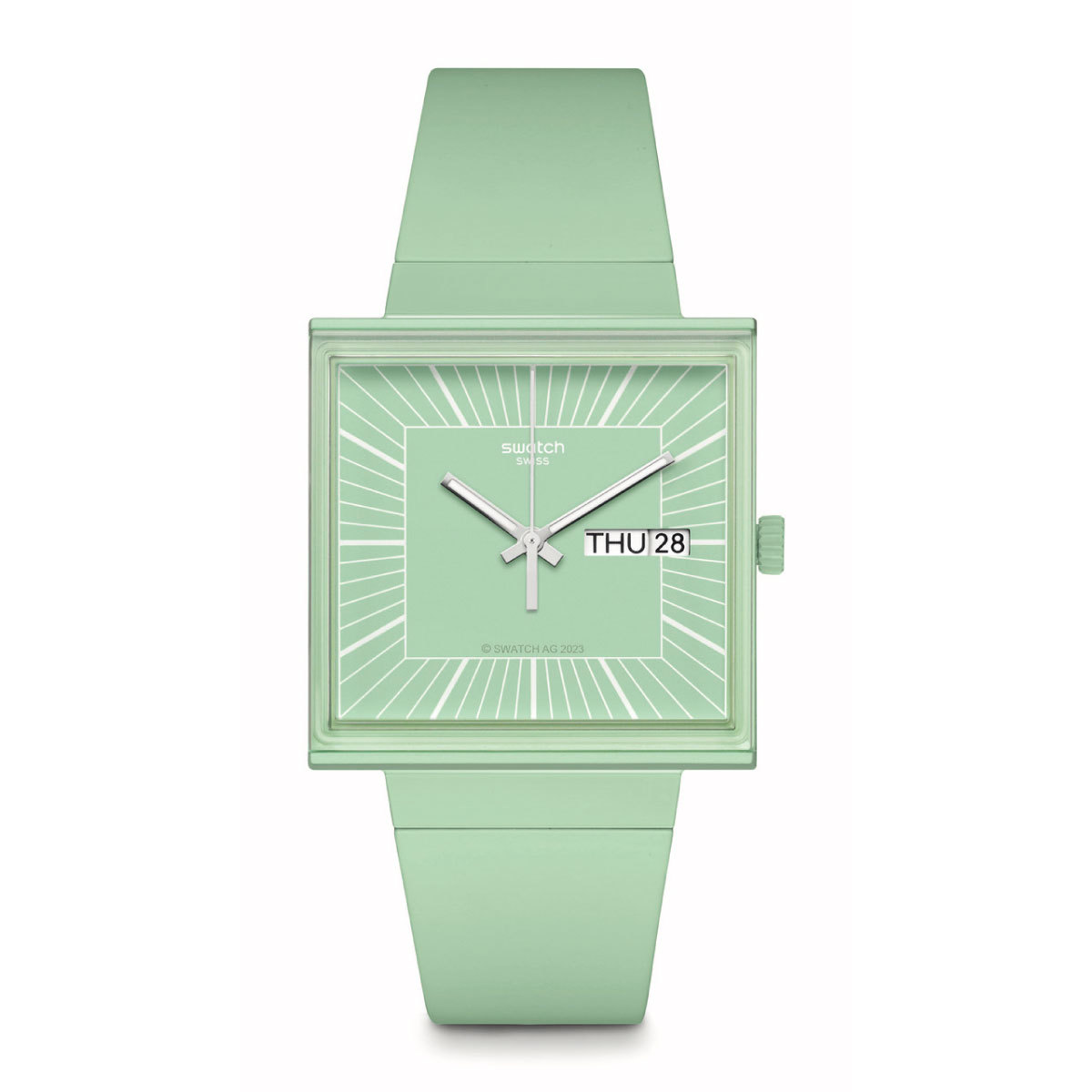 スクエア型のBIOCERAMICミントウォッチケースは、ホワイトプリントのインデックスがサイドから見られるエッジ・トゥ・エッジのバイオ由来素材のグラスが特徴です。