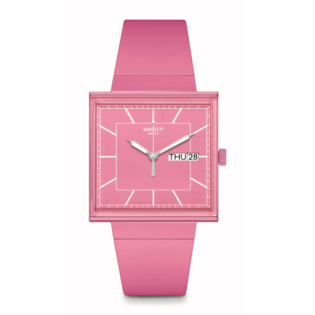 スクエア型のBIOCERAMICローズウォッチケースは、ホワイトプリントのインデックスがサイドから見られるエッジ・トゥ・エッジのバイオ由来素材のグラスが特徴です。
