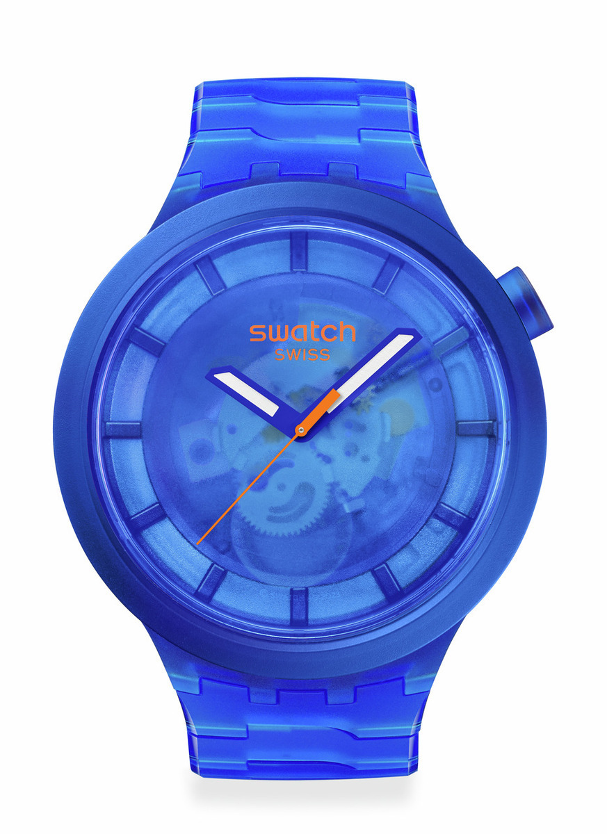 このブルーのオーバーサイズウォッチは、バイオ由来素材ケース、文字盤、ベゼルからバタフライバックル付きのバイオ由来素材ブレスレットに至るまで、全面が透明ルックになっているのが特徴です。