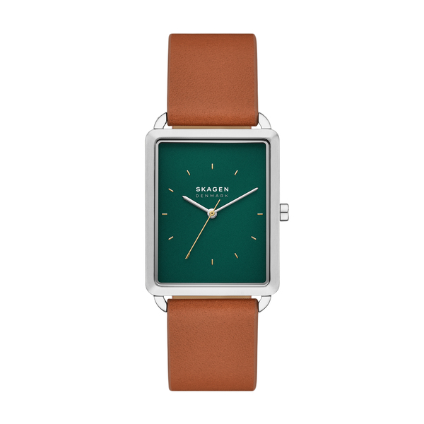 36mm径のケースに三針ムーブメントを搭載したHAGEN。サンドブラスト仕上げのグリーンのダイヤルに、ブラウンのレザーストラップを組み合わせました。