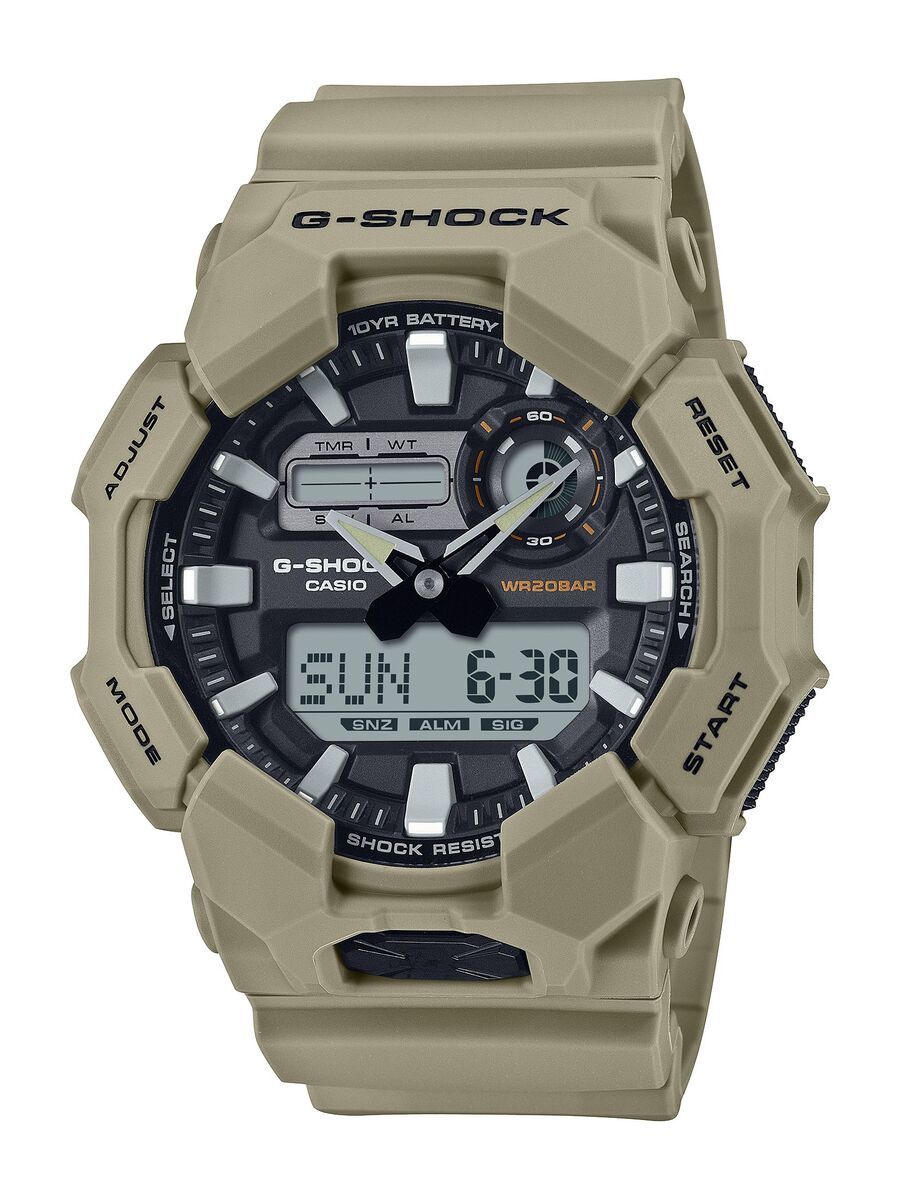 1983年の発売以来、飽くなき強さを求めて進化を続けるタフネスウオッチG-SHOCKから、10年バッテリーの新定番モデルです。ワイドフェイスとビッグケースで、10年バッテリーを搭載したデジタルモデルのGD-010とデジタルアナログコンビモデルのGA-010は、ワールドタイム、ストップウオッチといった基本機能をはじめ、大型フロントボタンで操作しやすいスーパーイルミネーターにより暗闇での視認性も確保します。バイオマスプラスチックやロングライフバッテリーにより、環境にも配慮したモデルです。ケース素材に、軽量ながら樹脂の概念を超える高剛性を発揮するカーボンファイバー強化樹脂入りファインレジンを使用。衝撃による破損、変形を防ぐことで、内部に配置したモジュールを保護します。各モデルともベースカラーのブラックに加えて、ワークスタイルにも合わせやすいカーキ、オレンジ、ブルーグリーン、ベージュといったカラーを展開。センターケース・ベゼル・バンドにバイオマスプラスチックを使用。カジュアルスタイルからワークスタイルまでアクセントになるクールなデザインです。