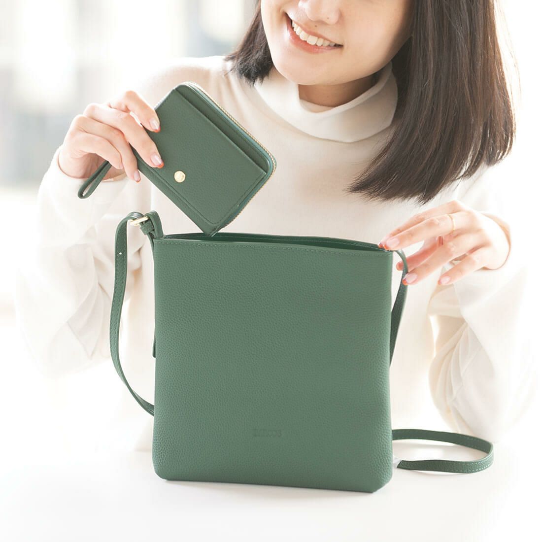 マットな質感のシュリンクレザーを使用したポシェットと財布のセット。