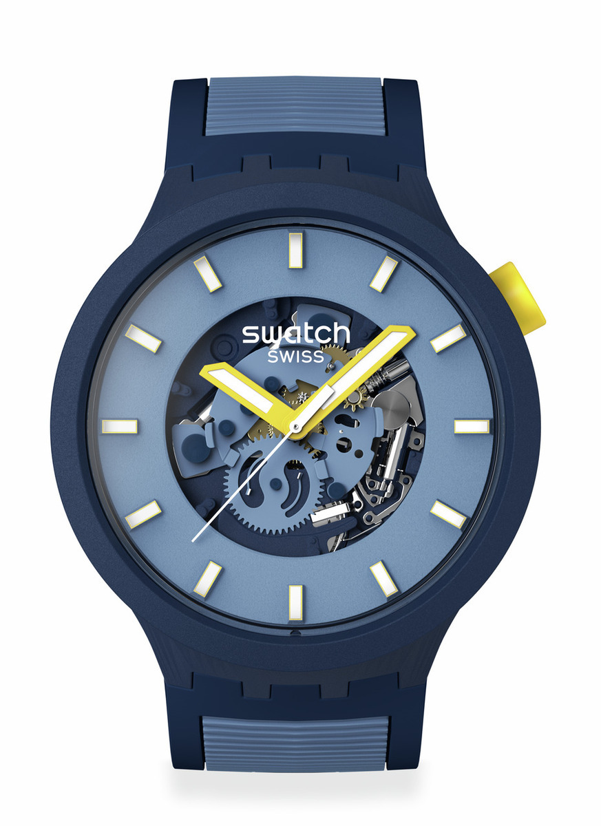 立体的なインデックスが特徴的なライトブルーのオープンダイアルに、ホワイトとイエローのプリント、イエローの暗闇で光る時針と分針、ホワイトの秒針、ライトブルーのムーブメントパーツを配し、すべてバイオ由来素材グラスのもとに収めたオーバーサイズウォッチ。