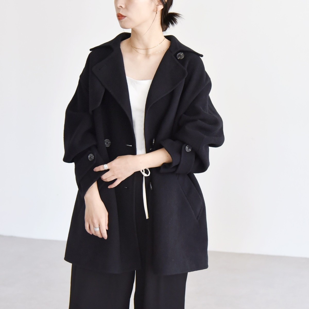 ワイドパンツやフレアスカートとも合う着丈にもこだわり、ボトムを選ばない万能コートに仕上げました。