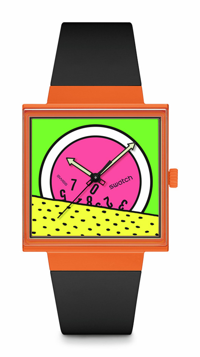 スクエア型マットオレンジのBIOCERAMIC時計ケースは、文字盤にプリントされたマルチカラーのデザインがサイドから見られるバイオ由来素材のエッジ・トゥ・エッジ・グラスが特徴です。