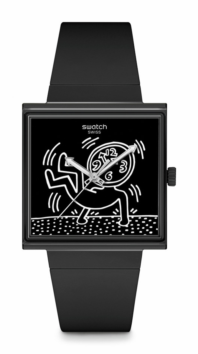ホワイトのプリントが施された裏側のマットブラックのバッテリーカバーには、キース・へリングが描いたSwatchのロゴが見られます。