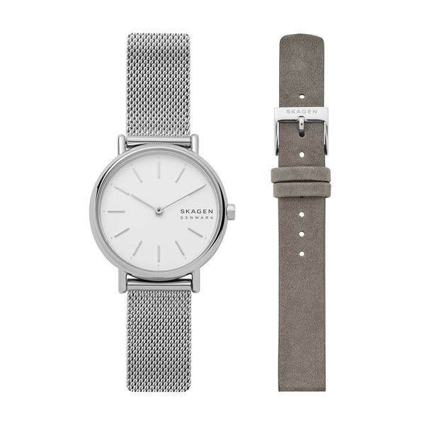 30mm径のケースに二針ムーブメントを搭載したSIGNATUR LILLEボックスセット。ホワイトのサンドブラストダイヤルに、シルバートーンのステンレススチール製メッシュストラップを組み合わせました。グレーの交換用レザーストラップが付属しています。