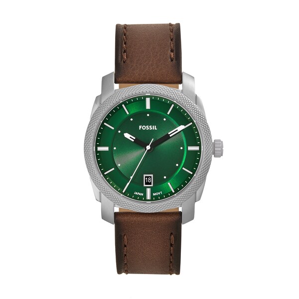 42mm径のケースにデイト表示付き三針ムーブメントを搭載したMACHINE。CD加工を施したグリーンのサンレイダイヤルに、ブラウンのレザーストラップを組み合わせました。 Fossilのレザー製品は、Leather Working Group(LWG)を通じて責任あるものづくりを支援しています。