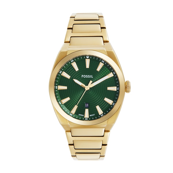 42mm径のケースにデイト表示付き三針ムーブメントを搭載したEVERETT。グリーンのサンレイダイヤルに、ゴールドトーンのステンレススチールブレスレットを組み合わせました。
