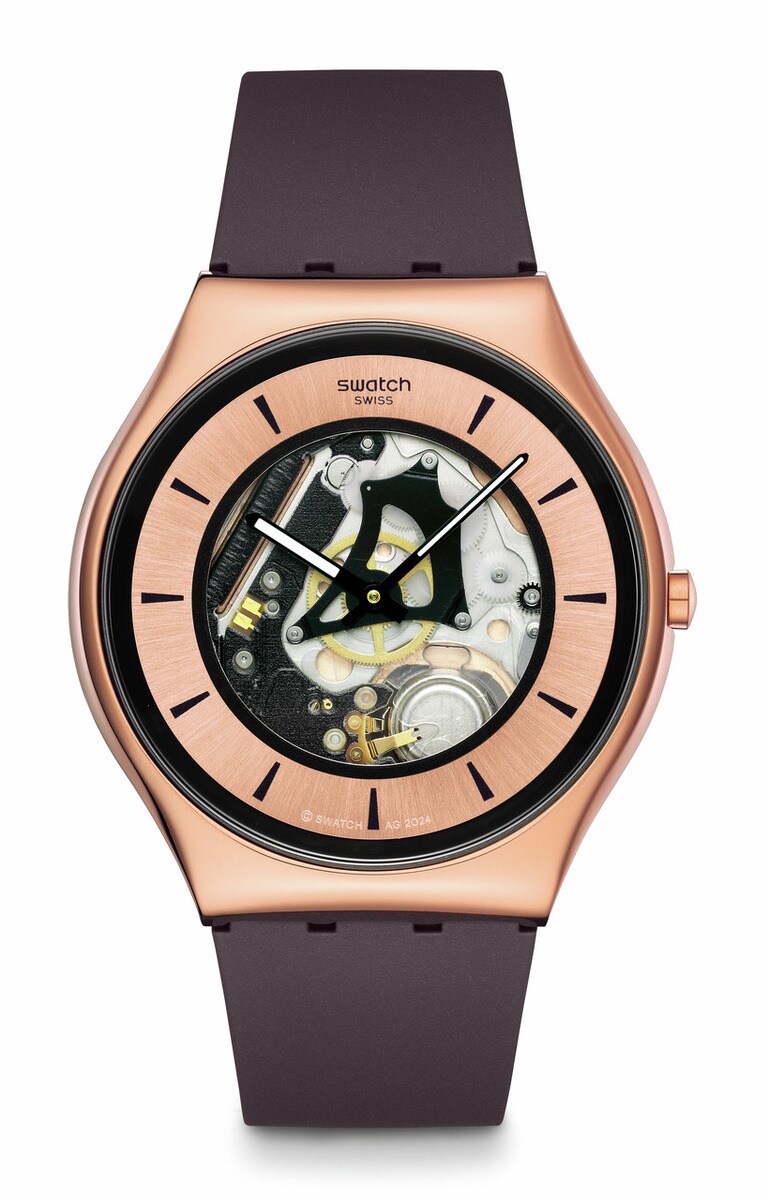 光沢のあるステンレススチール製のケースとバックルにはローズゴールドカラーPVDコーティングが施されていて、マットダークブラウンのストラップ、そしてお揃いのループと組み合わされています。
