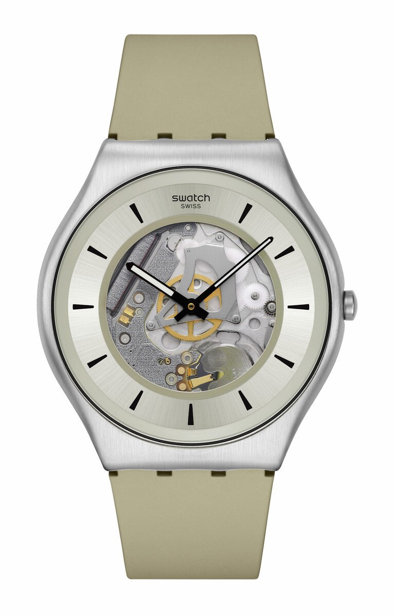 サンレイのステンレススチール製のケースとバックルはマットトープのストラップ、そしてお揃いのループと組み合わされています。
