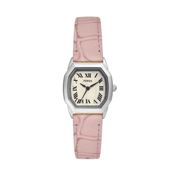 クラシックなアーカイブスタイルから着想を得て誕生したHARLOW。古くから愛されてきた洗練された魅力を再現したモデルです。このタイムレスなウォッチは、艶出し仕上げのステンレススチール製の八角形ケース、質感のあるクリームカラーのダイヤル、三針ムーブメント、しなやかなピンクの型押しレザーストラップが特徴です。Fossilのレザー製品は、Leather Working Group(LWG)を通じて責任あるものづくりを支援しています。